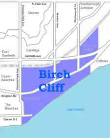 Birch Cliff is a neighbourhood in Toronto, Ontario, Canada. It is located in the southwest part of the old city of Scarborough running along the shore of Lake Ontario atop the western part of the Scarborough Bluffs. Birch Cliff has a large Irish population. About one-third of Birch Cliff residents are of Irish origin.[1][2]