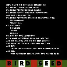 Bird Seed is the seventeenth album by power electronics group Whitehouse released in 2003 by their own record label, Susan Lawly. It was given an "honourable mention" in the digital musics category of Austria's annual Prix Ars Electronica awards.[3] It was reissued on double vinyl through Very Friendly in July 2009. The title track was recorded by Steve Albini and written by Peter Sotos.