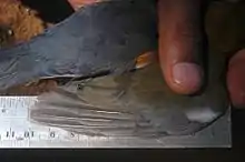The wing is usually measured from the bend of the wing to the tip of the longest primary feathers. Often the wings and feathers may be flattened so that the measure is maximized but in some cases the chord length with natural curvature is preferred.[4][5] In some cases the relative lengths of the longest primaries and the pattern of size variation among them can be important to measure.