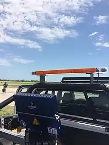 A bird control vehicle belonging to Copenhagen Airport Kastrup, equipped with various tools