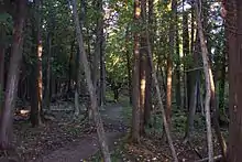 The park rises in a series of six low rounded hills. Those in the south and west stand 20 m (66 ft) above the surrounding land while those in the north and east are more than 40 metres (130 ft) higher.[5] A lookout tower has been built on Griffiths Hill at about the halfway point of the Chickadee hiking trail.[6]