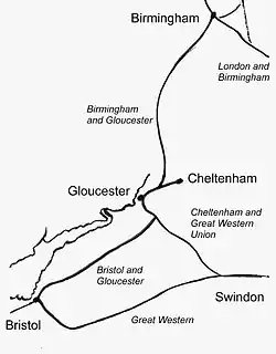 Sketchmap of the Birmingham and Gloucester Railway and its relationship to other lines