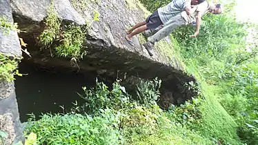 There are four corner bastions and the main gate in good condition. There are many stone cut water cisterns on the fort. Two cannons are now moved to the temple at the base of the fort. The view from the summit is pleasing with rice-fields and dense pockets of the jungle around.