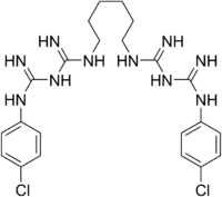 Structure of chlorhexidine, a bisbiguanide antiseptic.