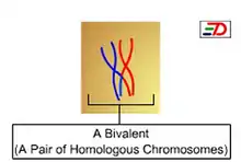 The formation of a bivalent occurs during the first division of meiosis (in the Zygotene stage of meiotic prophase 1). In most organisms, each replicated chromosome (composed of two identical sister chromatids[1][2]) elicits formation of DNA double-strand breaks during the leptotene phase.[3] These breaks are repaired by homologous recombination, that uses the homologous chromosome as a template for repair. The search for the homologous target, helped by numerous proteins collectively referred as the synaptonemal complex, cause the two homologs to pair, between the leptotene and the pachytene phases of meiosis I.[4] Resolution of the DNA recombination intermediate into a crossover exchanges DNA segments between the two homologous chromosomes at a site called a chiasma (plural: chiasmata). This physical strand exchange and the cohesion between the sister chromatids along each chromosome ensure robust pairing of the homologs in diplotene phase. The structure, visible by microscopy, is called a bivalent.[5]