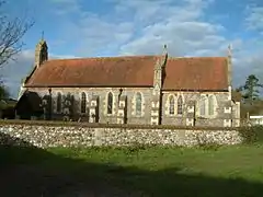 Bix Brand's original parish church of Saint James is a small Norman building in Bix Bottom, about 1 mile (1.6 km) north of the village. It has a nave, chancel and several Norman lancet windows.[2] Later additions include the Perpendicular Gothic east window and another Perpendicular window in the south wall.[2] In 1874 the architect John Gibson completed the village's new Church of England parish church, closer to the centre of the village, also dedicated to Saint James.[2] The new church has a north aisle and transept as well as a nave and chancel.[2] Two of the north aisle windows contain sections of late 15th century Flemish stained glass.[2] The old church was abandoned in 1875[2] and became ruined and overgrown.[3][4]