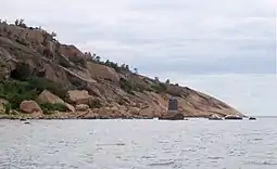 Photo of the original position of the lighthouse at 57°15.014′N 16°48.038′E. The foundation can still be seen at the eastern shoreline of national park Blå Jungfrun.