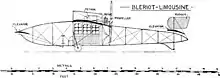 In late 1911 Blériot produced an aircraft of similar configuration which had been built to the order of Henri Deutsch de la Meurthe, the Blériot XXIV "Limousine" (also referred to as the Bleriot Aeronef and the Bleriot Berline), and it is probable that the Type XIII was intended as a developmental aircraft for this machine. This aircraft featured an enclosed cabin with mica windows for the passengers, built by the Rothchild coachbuilding company, with the pilot sitting in front of it, his only protection being a small conical windshield attached to the front outrigger cross-bracing wires. A speaking tube was provided to allow the passengers to communicate with the pilot.[2] It differed considerably from the Type XIII in its constructional details. The wings had elliptical ends, similar to those of the Blériot XI and used wing warping for lateral control. They were conventionally braced using wires, those above the wing being connected to a cabane made up of a pair of inverted V-struts with a longitudinal tube connecting the apexes: under this was a large teardrop shaped fuel tank. The tail surfaces were mounted of four wire-braced booms, and the front elevator on four curved booms attached to the front of the cabin. It was initially powered by a 100 hp (75 kW) Gnome 14 Omega-Omega, which was later replaced by a 140 hp (100 kW) Gnome 14 Gamma-Gamma. It was 14 m (46 ft) long with a wingspan of 13 m (43 ft) and, with fuel but without passengers, weighed 700 kg (1,540 lb).[2]