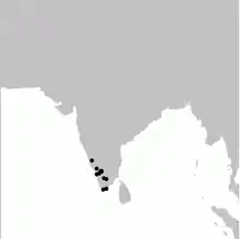 The main population of this bird is found in the high elevation plateaus above 1,500 m (4,900 ft) areas of the Nilgiris, Palani Hills, Biligirirangans (Bellaji and Honnametti) and Kannan Devan Hills. They prefer areas with high leaf litter and undergrowth in open shola grassland habitats. The density was about 2.8 ha (6.9 acres) per pair during the breeding season. It is a highly parochial bird and no local movements other than dispersal of young has been noted.[6] To the north, it occurs in the Kudremukh National Park and the Bababudan Hills and south to the Ashambu Hills.[7] Some old records of the species from Maharashtra and Sri Lanka[8] have been considered dubious.[3][6]