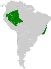 The nominate subspecies of black-bellied thorntail is restricted to coastal eastern Brazil from southeastern Bahia south through Espírito Santo into eastern Rio de Janeiro. D. l. melanosternon is found in Amazonia of southern Venezuela, southeastern Colombia, eastern Ecuador and Peru, far northern Bolivia, and western Brazil. It inhabits the edges and interior of humid lowland forest generally at elevations between 100 and 300 m (330 and 980 ft). In Amazonia it is mostly found in terra firme forest but also occurs in the transition zone between terra firme and várzea.[8]