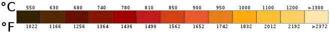 Black-body radiation has a characteristic, continuous frequency spectrum that depends only on the body's temperature,[10] called the Planck spectrum or Planck's law. The spectrum is peaked at a characteristic frequency that shifts to higher frequencies with increasing temperature, and at room temperature most of the emission is in the infrared region of the electromagnetic spectrum.[11][12][13] As the temperature increases past about 500 degrees Celsius, black bodies start to emit significant amounts of visible light. Viewed in the dark by the human eye, the first faint glow appears as a "ghostly" grey (the visible light is actually red, but low intensity light activates only the eye's grey-level sensors). With rising temperature, the glow becomes visible even when there is some background surrounding light: first as a dull red, then yellow, and eventually a "dazzling bluish-white" as the temperature rises.[14][15] When the body appears white, it is emitting a substantial fraction of its energy as ultraviolet radiation. The Sun, with an effective temperature of approximately 5800 K,[16] is an approximate black body with an emission spectrum peaked in the central, yellow-green part of the visible spectrum, but with significant power in the ultraviolet as well.