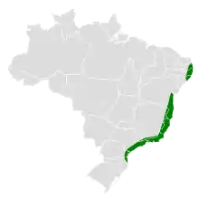 The black-cheeked gnateater is found in eastern Brazil, from Paraíba to Santa Catarina. Its natural habitat is subtropical or tropical moist lowland forests, where it is a bird of the understory and forest floor.[3] Its range along the eastern coastal areas of Brazil has been fragmented by destruction of habitat.[4] Despite the showy plumage, this and other gnateaters are furtive and not often seen.[3]
