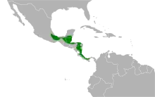 The species breeds in the Central American lowlands and foothills from sea level to about 1000 m altitude, and is found in the canopy and middle levels of dense wet forests, tall second growth, and semi-open habitats such as woodland edge and clearings. The nest is a bowl constructed from bromeliad leaves and other epiphytes 3–6 m high in a small tree or palm. The female lays three brown-spotted grey-white eggs between April and June.