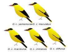 The subspecies in the Andamans, O. c. andamanensis has all black wings while O. c. macrourus of the Nicobars has a very broad nape band so that only the top of the head is yellow. The wings are all black with a yellow primary covert patch. The calls of the Andaman and the Nicobar subspecies are said to be quite different, the latter having a more modulated call note.[11][12] In the Southeast Asian populations some geographic trends include a reduction of yellow on the forehead and a decreased brightness in the yellow plumage from north to south. Females from southern populations are more greenish on the back and tail and there are no yellow spots on the tips of the secondaries as in northern populations.[13]