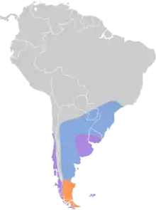The smallest member in its genus, it is found in freshwater marshes, lagoon and lake shores in southern South America. The black-necked swan breeds in Chilean Southern Zone, Patagonia, Tierra del Fuego and on the Falkland Islands. In the austral winter, this species migrates northwards to Paraguay, Bolivia and southern Brazil.[4] The wetlands created by the 1960 Valdivia earthquake like Carlos Anwandter Nature Sanctuary in Cruces River have become important population centers for the black-necked swan.[6]