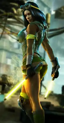 While Orchid retains many of her classic moves in the 2013 title, she has also been given several new skills, such as the ability to use her Fire Cat as a projectile in Instinct Mode and as part of her Shadow moves.[18][19] Her classic "retro" costume was included as unlockable content in a patch for the game.[20] According to Prima Games, Orchid is a very balanced character who "lives and dies by the 50/50 mix-up".[21] While Orchid "seems lacking compared to the other characters" in that "her special moves are mostly unsafe and she doesn't have that one abusive tactic that most of the other characters seem to possess", she has the fastest movement speed and her Instinct mode is one of the best in the game.[22]