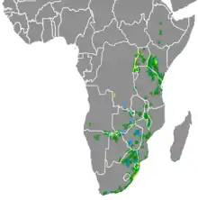 It is found in Angola, Botswana, Burundi, Democratic Republic of the Congo, Eswatini, Ethiopia, Kenya, Malawi, Mozambique, Namibia, Rwanda, Somalia, South Africa, South Sudan, Tanzania, Uganda, Zambia, and Zimbabwe.
