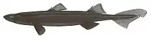 Adult black dogfish typically measure 60–75 cm (24–30 in) in length and can reach 1.1 m (3.6 ft), making it the largest member of its family.[5][9] Females attain a larger ultimate size than males.[8] The shark has a rather stocky and laterally compressed body, with a moderately long, thick, and flattened snout that forms a very broad arch at the front. The sizable, horizontally oval eyes are a reflective green in life and lack nictitating membranes (protective third eyelids); they are followed a short distance behind by much smaller spiracles (accessory respiratory openings). The nostrils are anteriorly placed and preceded by short flaps of skin. The mouth is wide and evenly arched, with thin lips and short but deep furrows around the corners. There are around 34 tooth rows in either side of both jaws; each tooth has three (occasionally up to five) slender cusps, with the central one the longest.[6][9][10]