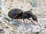 The black garden ant (Lasius niger), also known as the common black ant, is a formicine ant, the type species of the subgenus Lasius, which is found across Europe and in some parts of North America, South America, Asia and Australasia. The European species was split into two species; L. niger, which are found in open areas; and L. platythorax, which is found in forest habitats.[1] It is monogynous, meaning colonies contain a single queen.