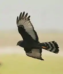 The black harrier (Circus maurus) is a medium-sized African harrier whose range extends from South Africa to Botswana and Namibia. It has a wingspan of 105–115 cm (41–45 in) and a body length of 44–50 cm (17–20 in).[2] When perched, this bird appears all black. However, in flight a white rump and flight feathers become visible. Its morphology is comparable to that of other harriers, with a slim body, narrow wings and a long tail. Male and female plumages are similar. Juveniles have buff under-parts and heavily spotted breasts.