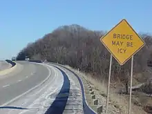 Bridges and overpasses can be especially dangerous. Black ice forms first on bridges and overpasses because air can circulate both above and below the surface of the elevated roadway when the ambient temperature drops, causing the bridge pavement temperature to fall more rapidly.[9] In the United States, road warning signs with the advisory Bridge May Be Icy indicate potentially dangerous roadways above bridge structures.