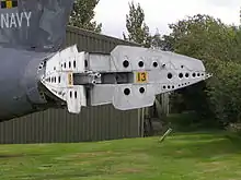 The bomb bay could also accommodate a 2,000-litre (440 imp gal; 530 US gal) ferry tank, a photo-reconnaissance 'crate', or a cargo container. The reconnaissance package featured an assortment of six cameras, each at different angles or having different imaging properties, and was only mounted on missions specifically involving reconnaissance activities.[40] The Buccaneer also featured four underwing hard points capable of mounting 1,000-pound (450 kg) bombs, missiles, fuel tanks, or other equipment such as flares;[34] later developments saw the adoption of wing-mounted electronic warfare and laser designator pods.[15] A similar underwing configuration was latterly adopted by the SAAF.[41] Upon its entry into service, the Buccaneer was capable of carrying practically all munitions then in use by Royal Navy aircraft.[42] It was intended for a pack with twin 30 mm (1.2 in) ADEN cannons to be developed for the Buccaneer, but the effort was abandoned and the type was never equipped with a gun.[43]