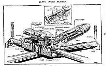 The Bombard was a 29mm spigot mortar,[1] weighing 112[12] alone and 360 lb,[11] on its mobile platform. It was able to fire a 20 lb high-explosive bomb to a range of approximately 100 yards; when the bomb detonated, it was able to inflict significant damage on a tank, although it was unlikely to actually pierce the vehicle's armour as the projectile was not able to gain sufficient velocity.[6] It was served by a crew of between three[1] and five men[11] The Bombard was considered to be most effective at short range, with targets being engaged with 'considerable success' at a range of between 75–100 yards.[1] It was a muzzle-loaded weapon and therefore had a slow rate of fire, averaging between six[13] and twelve rounds per minute; as such it was considered vital that the weapon be well-camouflaged and that it hit the target with the first shot. Two types of ammunition were provided for the weapon – a 20 lb anti-tank bomb and a lighter 14 lb anti-personnel bomb,[13] with each weapon being issued with 150 rounds of the former and 100 of the latter.[1] The anti-tank rounds were found to possess several problems. They had insensitive fuzes, which meant that they would often pass through an unarmoured target without detonating, and when they did explode fragments were often thrown back at the crew.[11] The Bombard was either affixed to a large cruciform platform, or an immobile concrete pedestal;[12] in either case would usually be placed in range of defensive positions, such as road-blocks.[7] It seems that there was a preference for the Bombard to be used primarily in a static role, with extra mountings being built by the Royal Engineers to provide alternative positions from which the weapon could be fired.[1] In a static position, the weapon was usually emplaced in a pit with ammunition lockers nearby.[13]