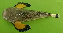 The blackfin stonefish has 15 to 17 spines and 4 to 6 soft rays in its dorsal fin, typical counts being 16 spines and 4 soft rays. There are 3 spines and 7 or 8 soft spines in the anal fin, 14-15 fin rays in the pectoral fin and a single spine and 5 soft rays in the pelvic fins. All the fin rays are simple and are not branched. The head is depressed with an upwards pointing mouth and upward pointing eyes on the head’s dorsal surface. There are no deep pis on the head. The body is greyish brown mottled with pale. The dorsal fin is dark while the caudal fin is pale with a black submarginal band. The anal, pelvic and pectoral finshave yellow bases and wide black distal bands.[6] This species reaches a maximum total length of 13 cm (5.1 in).[7]