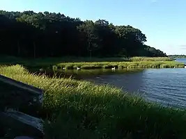 Ecologically, the Blackstone Conservation District is a Northeastern coastal forest.[6] The woodland is dominated by broadleaf trees, predominantly oak, American beech, and black birch. The woods and shoreline are home to many species of shorebirds, gulls, owls and songbirds, as well as various small mammals. The ponds are home to several species of turtle. Along the Seekonk River, there are horse mussels, horseshoe crabs, and occasional harbor seals.[2]
