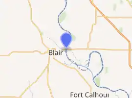 The Blair Bridge carries the Union Pacific Railroad's Blair Subdivision between the U.S. states of Nebraska and Iowa, across the Missouri River near Blair, Nebraska. It was built in 1883 by the Sioux City and Pacific Rail Road, replacing a car ferry.[1] Automobile traffic crosses via the parallel Blair Bridge (U.S. Route 30).