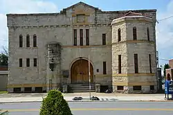 Blairsville Armory is a historic National Guard armory located at Blairsville, Indiana County, Pennsylvania. It was designed by Pittsburgh architects W.G. Wilkins & Co. It was built in 1909, and is a "T"-shaped, two-story, three-bays wide and nine-bays deep, castle-like building in the Romanesque Revival style. The front section is the flat-roofed administration building, with a gable roofed drill hall behind. It front facade features a central arched entrance with a five-sided, two-story bay window on the right side.[2]