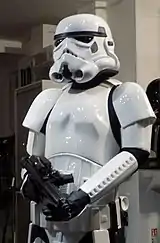 ![]() An E-11 blaster rifle, the standard issue weapon used by Imperial stormtroopers (the prop is based on the frame of a real Sterling submachine gun). | |