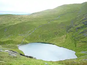 Below Tarn Crags is Scales Tarn, an almost circular waterbody filling a corrie. The bed plunges steeply to about 25 ft (7.6 m) and plants and fish are scarce.[5]