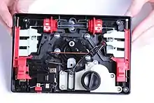 The LED (and series resistor) is the only electrical component of the game, and is powered by two AA batteries.[5] As a result, with sufficient ambient light the game is playable without batteries as one can see the unlit LED under the screen.[3]