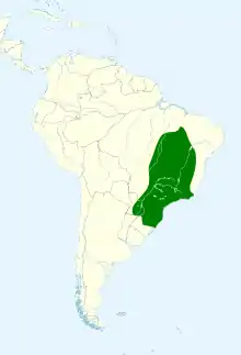 In eastern and southeastern South America, the blond-crested woodpecker ranges in eastern and central portions of the cerrado; it is also in most of the caatinga. A small range of the bird, (disjunct), occurs at the mouth of the Amazon River and upstream for 800 km in the Amazon basin; the range also covers the southern parts of Marajó Island. Its habitats include rainforest, gallery forest, plantations, palm groves, wooded savannah, orchards and gardens, at altitudes up to 1,200 m (4,000 ft).[2]