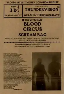 "Scream bags" were also provided to moviegoers as a promotional tie-in. The bags had a long poem about Blood Circus on each side, as well as a coupon for a free diamond ring from Rigatuso's "Santo Gold" infomercials.[3]