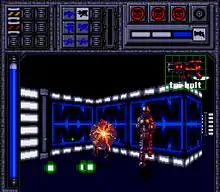 The player's default weapon is a simple pulse reserve gun. Players can find one of ten special weapons scattered around the level. Each special weapon has a limited amount of ammo, and the player must obtain a new weapon to refresh the ammo;[1]: 9 however, collecting a special ammo pickup will replenish the ammo for all of the weapons.[5] The player cannot use the reserve gun if they have any special weapons.[1]: 9 Areas in each level are separated by sliding doors, in which players can open unconditionally; some of the doors are locked, and players must find and use the passkeys to unlock them.[1]: 8 The game features the on-screen map to help players navigate the level.[5] The health is represented by an oxygen supply, which depletes whenever a hit from enemy fire or a mine is taken. A life is lost when the player's oxygen is emptied. Players start the game with three lives; the game is over when all the lives are exhausted. Extra oxygen and lives can be found throughout the maze.[1]: 7
