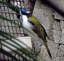 Keeping blue-faced honeyeaters in an aviary in New South Wales requires a Class 2 Licence. Applicants must show they have appropriate housing, and at least two years' experience of keeping birds.[52] Blue-faced honeyeaters are exhibited at Lincoln Park Zoo in Chicago,[53] Philadelphia Zoo,[54] Birmingham Zoo (Alabama), and Tracy Aviary (Utah)[55] in the United States,[56] Chessington Zoo in England,[57] Edinburgh Zoo in Scotland and Taronga Zoo in Sydney, Australia.[58]