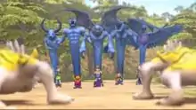 The party arrives at a giant Mechat base in the clouds and are tossed into the throne room of Nene, the apparent leader. Nene explains to them how he enjoys hearing the screams of the dying victims of the Land Shark. The party battles Nene, but are easily defeated.[14] They are thrown out of the base and start to fall to their deaths, but a beam of light from the base catches them, and brings them back to the base. The party find three small floating spheres in the middle of the room; a mysterious voice commands them to swallow the spheres. The party refuses, and instead hold onto the spheres for safekeeping. As they try to reach another Mechat to escape the base, they are forced to fight a large army of Nene's robots. When the battle seems it will never end, and with the unseen voice promising them knowledge of how to pilot the Mechat, the party members eat the spheres. As they consume the spheres, a strange transformation occurs to each, changing the forms of their shadows into powerful beings that are able to destroy the robot army. The party escapes the base and crash in a desert.[15]