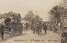 For many years on the first Thursday of every month, Western Avenue south of the canal and to the city limits on 139th Street was host to an open-air market, the Blue Island Market, more commonly known as Market Day. The market was a place where farmers from a wide area surrounding Blue Island came to town to sell their wares to each other and to the public at large.[20] As the postcard image to the right shows, items offered included produce, farm equipment, and livestock, with a local band thrown in to provide entertainment. Market Day began sometime in the last quarter of the 19th century and lasted until May 1924, when it was closed by the city council after a gradual influx of peddlers offering shoddy merchandise discouraged farmer participation and the market was deemed a public nuisance.[21]: 148