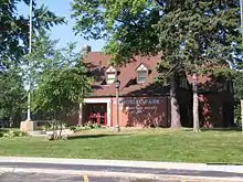 One of the oldest buildings in Blue Island,[53] the American House was built in 1839 as the courthouse for Lake County, Indiana—a function it never actually had the chance to serve, as the county seat was moved from Liverpool to Crown Point in 1840.[54] In 1844, the building was disassembled, sent by raft up the Little Calumet River, and reassembled in Blue Island.