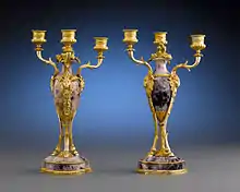 The most common explanation for the name is that it derives from the French bleu-jaune, meaning 'blue-yellow'. The story goes that Blue John was exported to France where it was used by ormolu workers during the reign of Louis XVI (1774–91). However, there is no archival record of any Blue John being exported to France,[1]: 7 and the early ormolu ornaments which use Blue John were being manufactured by Matthew Boulton of Birmingham in the 1760s.