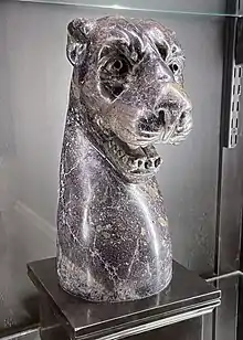 Roman writers, such as Pliny the Elder, refer to a soft ornamental rock which they called murrhine, out of which drinking vessels were carved.[1]: 53 Pliny describes the mineral as having a "great variety of colours" with "shades of purple and white with a mixture of the two".[1]: 53 Whether this mineral was banded fluorite is uncertain, but it was apparently soft enough (like fluorite) to allow one particular man of consular rank to gnaw at the edges of his cup.[1]: 54 There is no reason to suppose the mineral came from Britain – Pliny and other writers specifically state that the mineral came from Persia.[1]: 54 It is sometimes claimed that Blue John vases were found during excavations at Pompeii,[5] but these vases are in fact made from banded amethystine quartz.[1]: 53 However, two cups have been found among Roman grave-goods near the Turkish/Syrian border, on the former Persian-Roman trade route, which were made from blue-yellow banded fluorspar presumably obtained from the Persian source mentioned by Pliny.[1]: 55 Both cups, known as the Crawford Cup and the Barber Cup, are in the British Museum.[6][7]