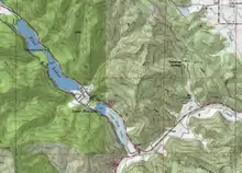 The Blue Lakes as a whole have a length of about 3 miles (4.8 km) and a breadth of 1⁄2 mile (0.80 km).[5] They form a line running in a northeast direction down to Scotts Creek, which drains into Clear Lake. The upper two lakes are connected by a wide channel, and are known collectively as Blue Lake or Upper Blue Lake. The settlement of Midlakes lies between Blue Lake and Lower Blue Lake, which is connected by a short channel to Scotts Creek. California State Route 20 runs along the northeast shore of the lakes.[6]
