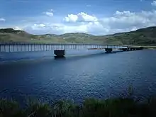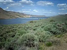 The centerpiece of the plans for the Gunnison was the construction of four dams on a 40-mile stretch (64 km) of the river east of the National Park Service's Black Canyon of the Gunnison National Park, projects that would not only help control the amount of water flowing into the Colorado, but would also create new opportunities for flood control, water storage, and the generation of hydroelectric power.[4] The first of these dams was Blue Mesa Dam, which was begun in 1962 approximately 30 miles (48 km) west of Gunnison, and 1.5 miles (2.4 km) west of Sapinero. Finished four years later, the dam created Blue Mesa Reservoir, which became the primary water storage reservoir for the Curecanti Unit (later renamed the Wayne N. Aspinall Unit).[5]