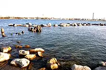 Perhaps the most striking different aspect of the new St. Clair River shoreline along the Blue Water River Walk is the huge stone and boulder structures sticking up from the water just offshore. These huge offshore reefs extend down almost 15 feet into the river bottom. The large boulders seen on the surface weigh as much as 4,000 pounds. They are resting on two other layers; recycled slabs of cement on the very bottom and a middle layer of smaller boulders. All together, over 8,000 tons of rock, stone, cement and boulders were used to build these reefs.[1]