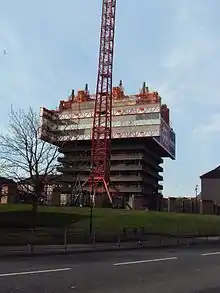 Demolition of the towers was originally scheduled to take place prior to the 2014 Commonwealth Games, but the complexity of the task pushed the date back to early 2015. Owing to the buildings' design, and their close proximity to the busy North Clyde Line railway which runs immediately next to the site, a conventional "blowdown" with explosives was deemed impractical. The buildings instead would be literally disassembled floor by floor using the "top down" method.[5] The deconstruction process began on in January 2015, starting with the Bluevale tower. The neighbouring Whitevale tower was deconstructed in a similar fashion in 2016.[6]
