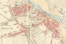 As trade in Blyth continued to grow, so did the population. Development of the Cowpen Quay and Waterloo areas began in about 1810 and 1815 respectively, and between the 1850s and 1890s major house building took place in these areas.[18] Blyth railway station, first built in 1847, was relocated in 1867 and rebuilt in 1896,[19] to cope with the increase in goods and passenger traffic.[20] The 1890s saw the filling in of "the Slake" (also known as "the Flanker" or "the Gut"). The Slake was a tidal inlet which stretched south from the river, across the site of today's bus station, along the route of Beaconsfield Street, and on past Crofton Mill Pit.[13] Before it was filled in, it almost entirely separated Blyth from Cowpen—Waterloo Bridge providing the only main link. Once it was removed, the two areas could combine and allow the town to begin to take its present form. The town continued to expand in the 20th century; much large-scale house building took place in the 1920s and 1930s, and from the 1950s to the 1970s.[18]