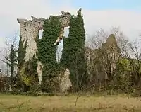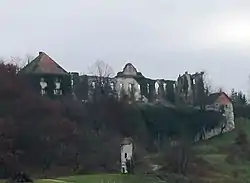 Boštanj Castle (Slovene: grad Boštanj, German: Weißenstein) stands on the foundations of a Roman fortification.[3] It was built up in the mid-16th century by Jacob von Lamberg. In 1678 ownership was assumed by the Ursini-Blagay family, who remained the owners until the beginning of the 20th century. It was a Renaissance castle designed like a fortress with a central rectangular building fortified with towers and a defensive wall.[6] The castle contained many late Gothic and Renaissance architectural elements, and also featured valuable Rococo and Classicist murals and ceiling paintings.[3] During the Second World War, after forcing besieged White Guard forces at the castle to withdraw to Turjak Castle,[7] the Partisans plundered and burned Boštanj Castle on 12 September 1943.[3][8] The castle burned for 14 days and the local fire department was forbidden from extinguishing the fire.[9]
