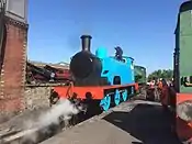 | No. 1 Lord Roberts | Neilson Reid 0-6-0T | No. 1 was built by the former Glasgow-based company and was sold to Coltness Iron Company near Lanarkshire in 1902, and that year was named after a famous Field Marshal of the Victorian and early Edwardian eras. After many decades spent both in operation and in store, the National Coal Board acquired it for further duties in 1955. Major damage was the cause of withdrawal in 1968 and it was eventually donated to the SRPS for restoration and future use. Restoration was completed in 1996 and it became a fully licensed Thomas the Tank Engine replica for events. Boiler lifted back into the frames March 2017 and returned to service 13 May 2017. | Thomas the Tank Engine NWR Blue. | 1899 | ![]() |